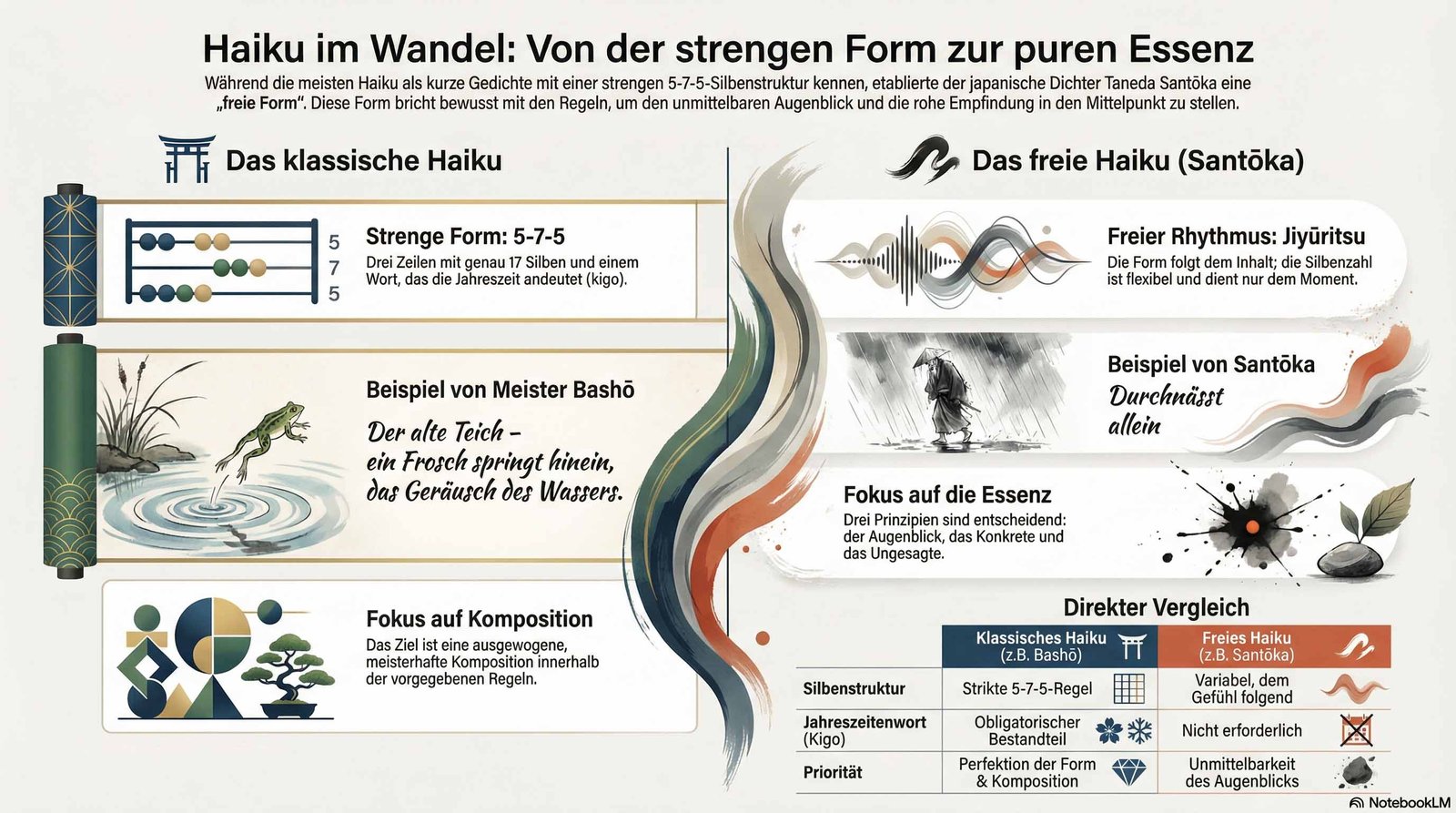 Wer Haiku kennt, kennt die Regel: 5-7-5 Silben. Drei Zeilen, siebzehn Silben, fertig. So lernt man es in der Schule, so steht es in den Büchern. Doch Taneda Santōka hielt sich nicht daran. Seine Haiku haben manchmal zehn Silben, manchmal zwanzig, manchmal nur sechs. Er schrieb, wie er ging: ohne festes Ziel.
