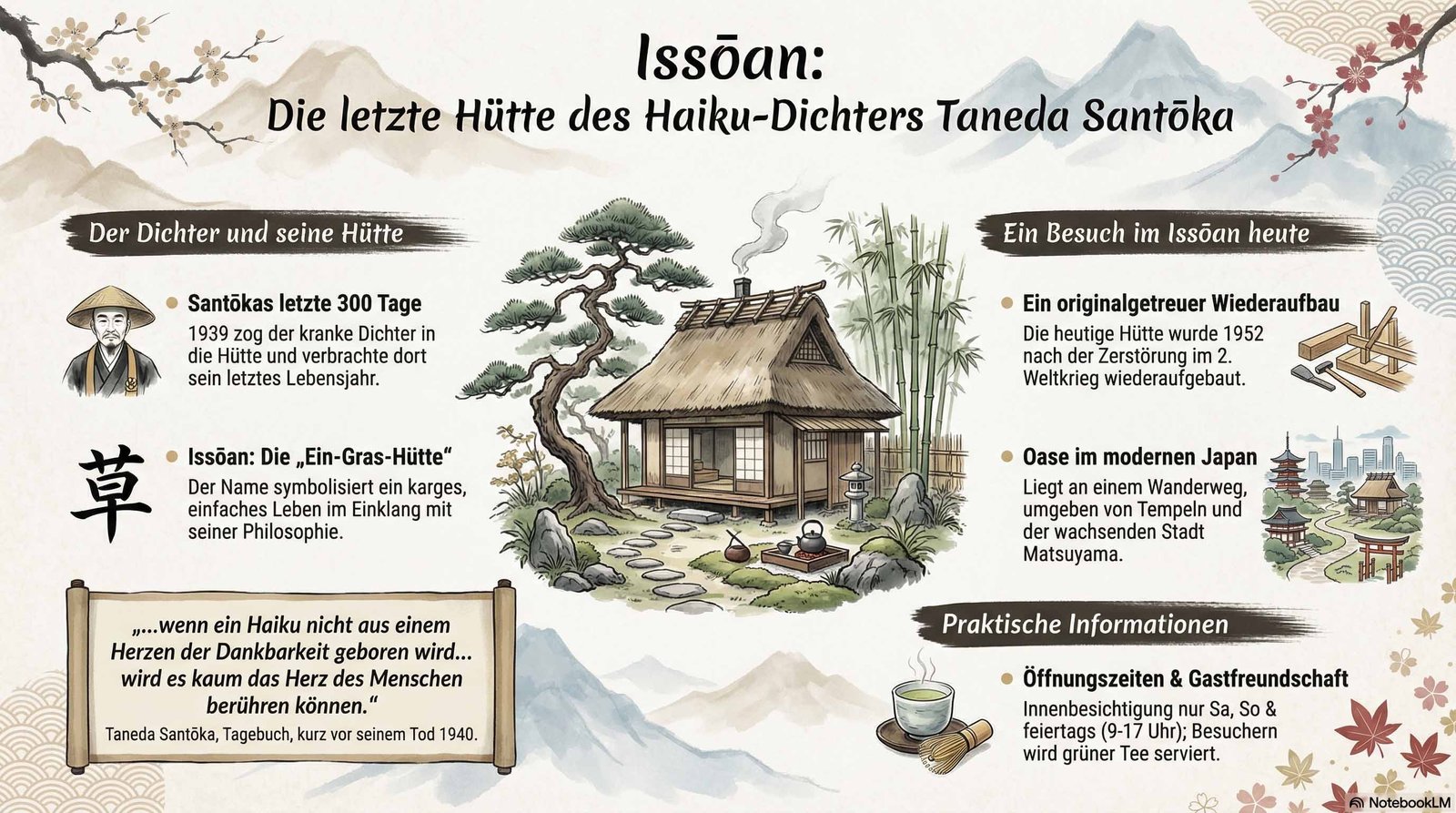 Im Dezember 1939 kam Santōka nach Matsuyama, in die Präfektur Ehime auf der Insel Shikoku. Er war müde, krank, am Ende seiner Wanderungen. In einer kleinen Hütte am Hang eines Hügels verbrachte er seine letzten 300 Tage. Diese Hütte, das Issōan, steht noch heute.