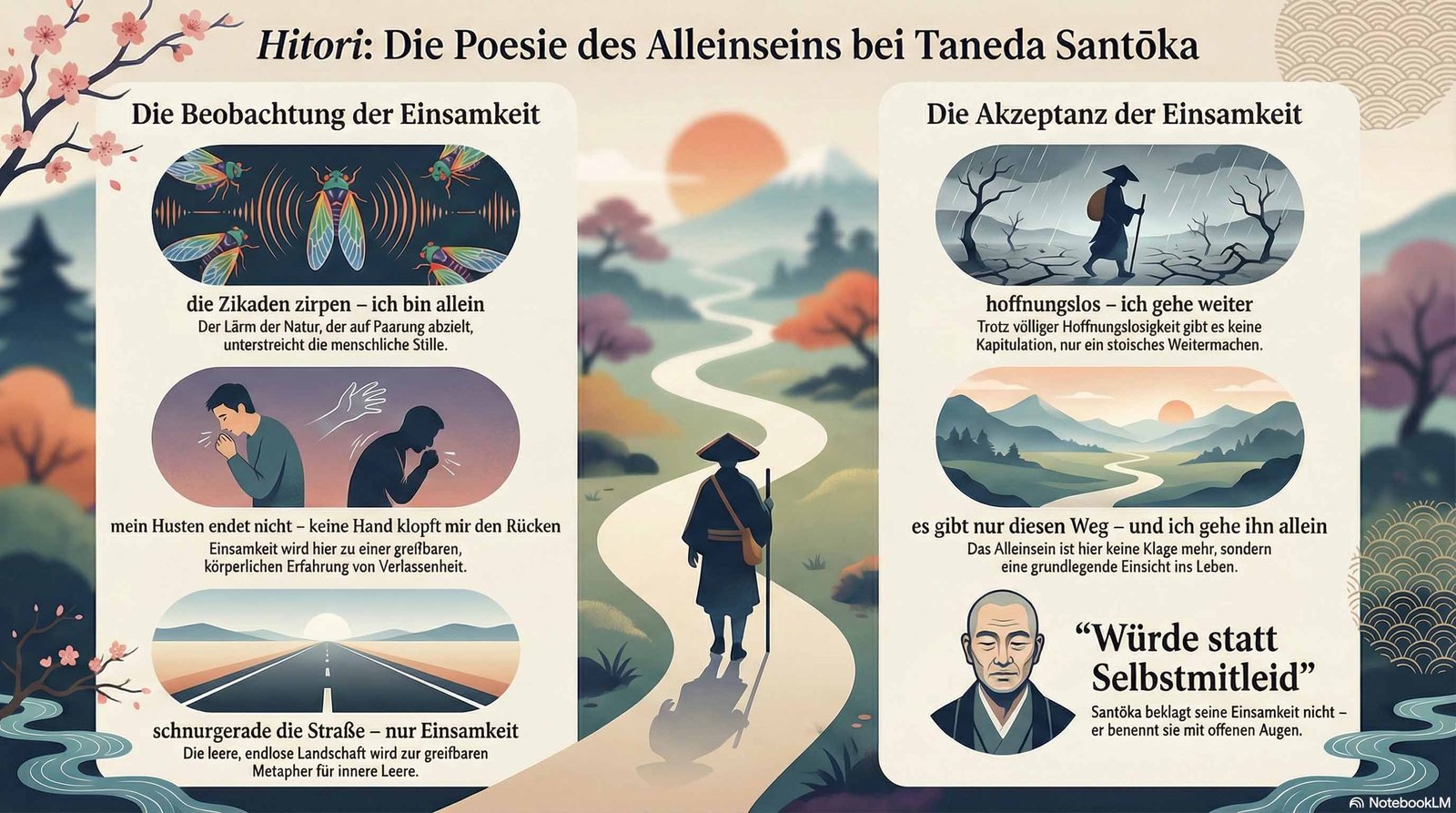 Kein Wort taucht in Santōkas Haiku häufiger auf als »hitori« – allein. Es ist nicht nur ein Zustand, es ist sein Lebensgefühl. Der wandernde Mönch, der niemanden hat, der nirgendwo hingehört, der durch Japan zieht wie ein Blatt im Wind.