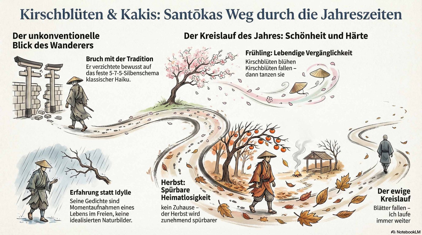 Santōka war ein Erneuerer des Haiku, der sich bewusst von den klassischen Regeln abwandte. Kein festes 5-7-5-Silbenschema, oft kein Jahreszeitenwort (Kigo). Und doch: Die Jahreszeiten durchziehen sein Werk wie ein roter Faden. Kirschblüten im Frühling, Zikaden im Sommer, Kakis im Herbst, Schnee im Winter – er beobachtete den Kreislauf der Natur mit wachen Augen.